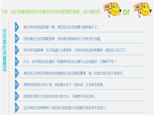 培训从一场有趣的时间管理测试展开,通过有趣的问答让大家快速进入情境,加深对培训必要性的认知。时间和才华是我们一生拥有的两大财富,但若是随着时间的流逝,我们的才华并没有增加,这就是虚度了时光。只有我们妥善安排并利用好时间,通过实现人生旅途中一个个小目标,才能最终实现自己的人生大目标,实现规划中的理想生活。